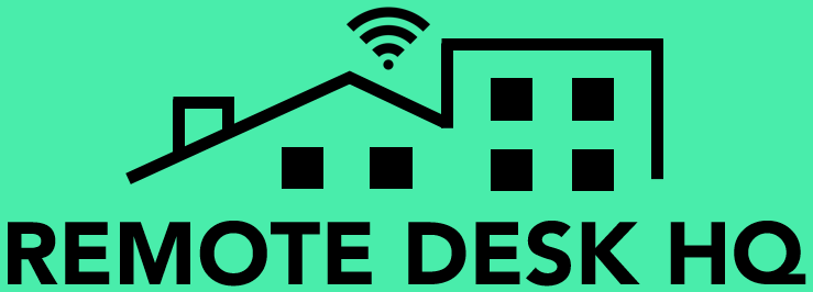 A person uses a MacBook Air laptop while sitting on a gray couch. The laptop screen displays a webpage with a serene mountain landscape and text related to remote jobs.